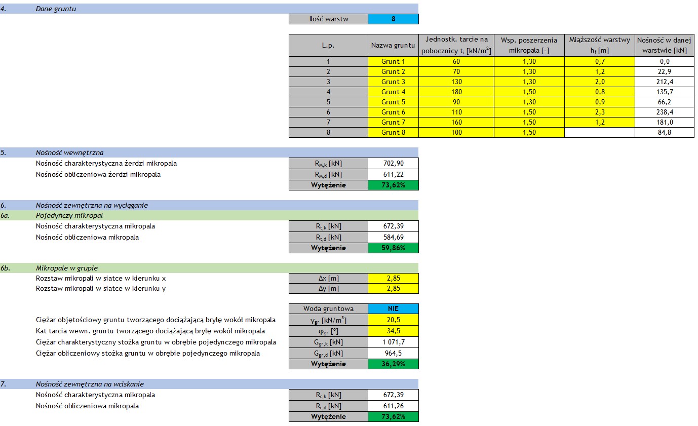 Użytkownik ma możliwość zdefiniowania profilu podłoża gruntowego z uwzględnieniem do 8 warstw gruntu, wraz z odpowiednimi parametrami geotechnicznymi. Na tej podstawie program wykonuje obliczenia nośności mikropala zarówno ze względu na współpracę z gruntem, jak i nośność samego elementu konstrukcyjnego.