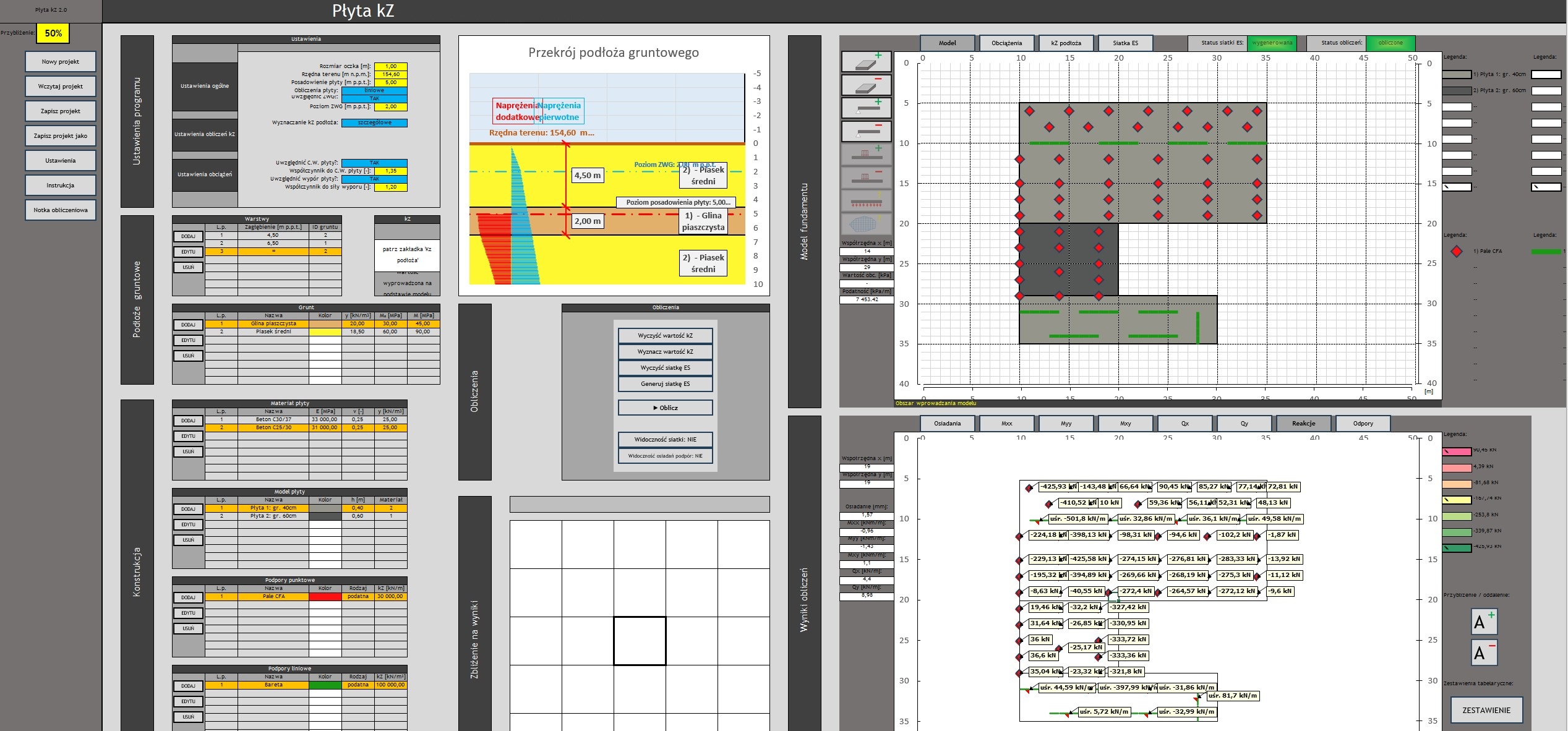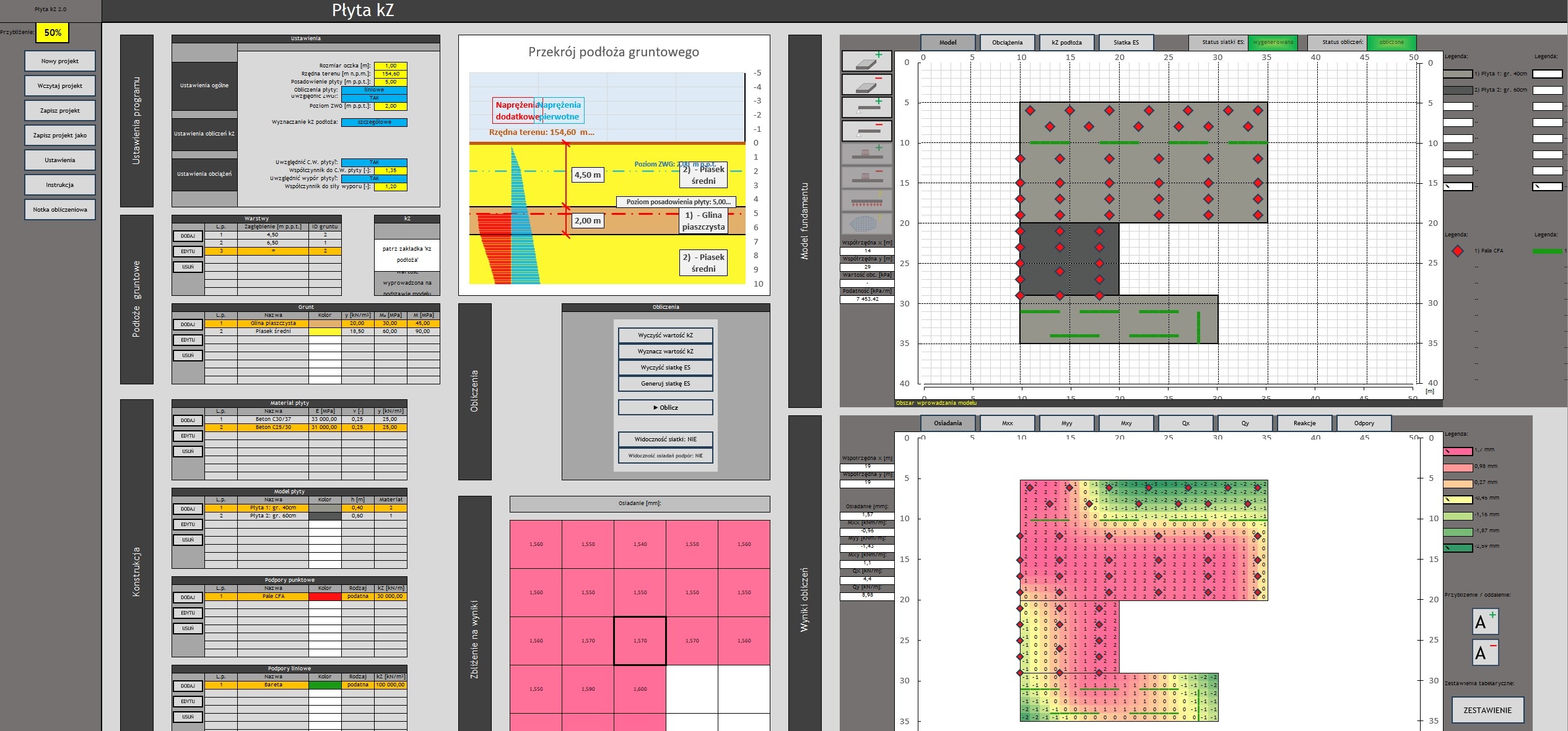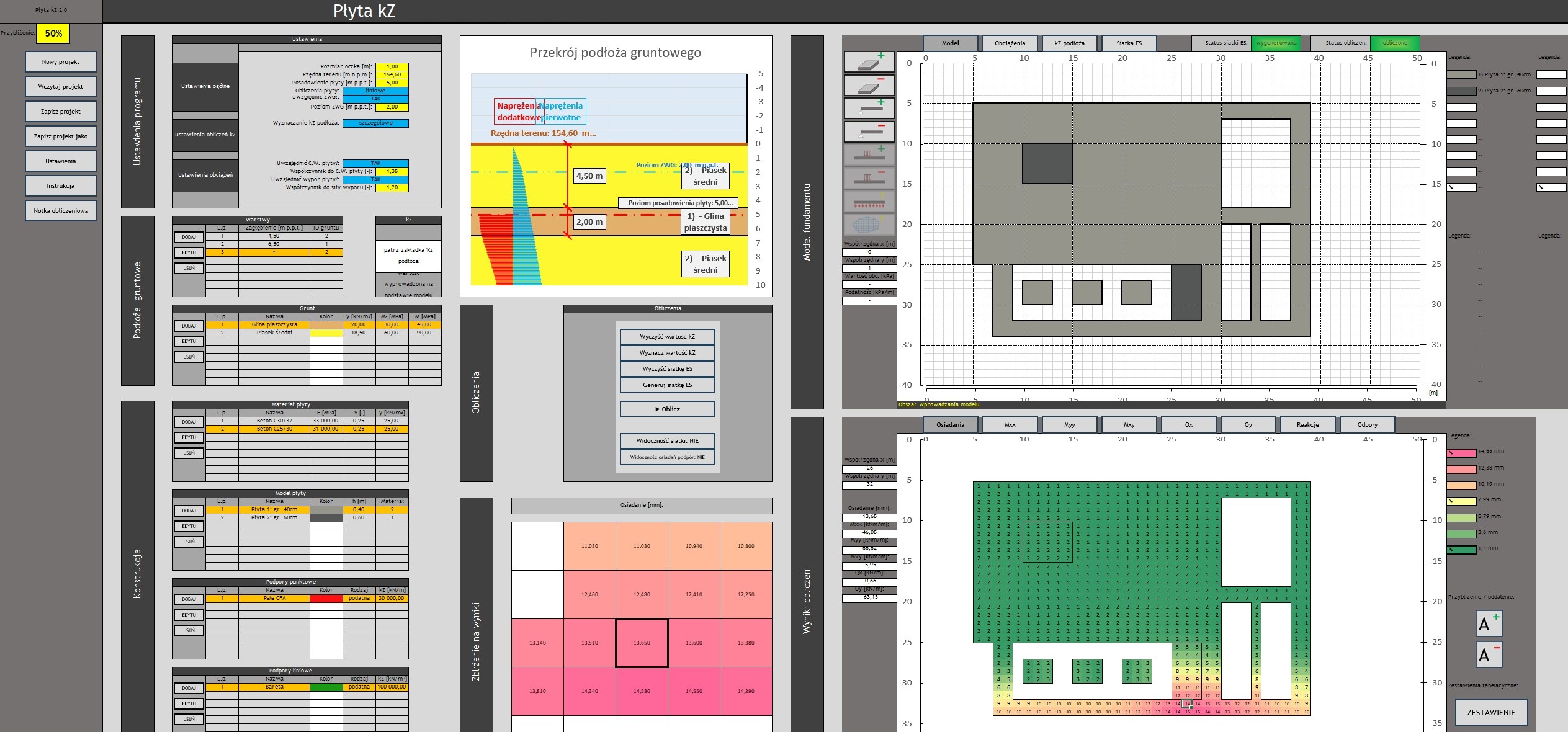 - Mapa odporów gruntu w wynikach – Wizualizacja rozkładu odporów gruntu, ułatwiająca interpretację współpracy płyty z podłożem.