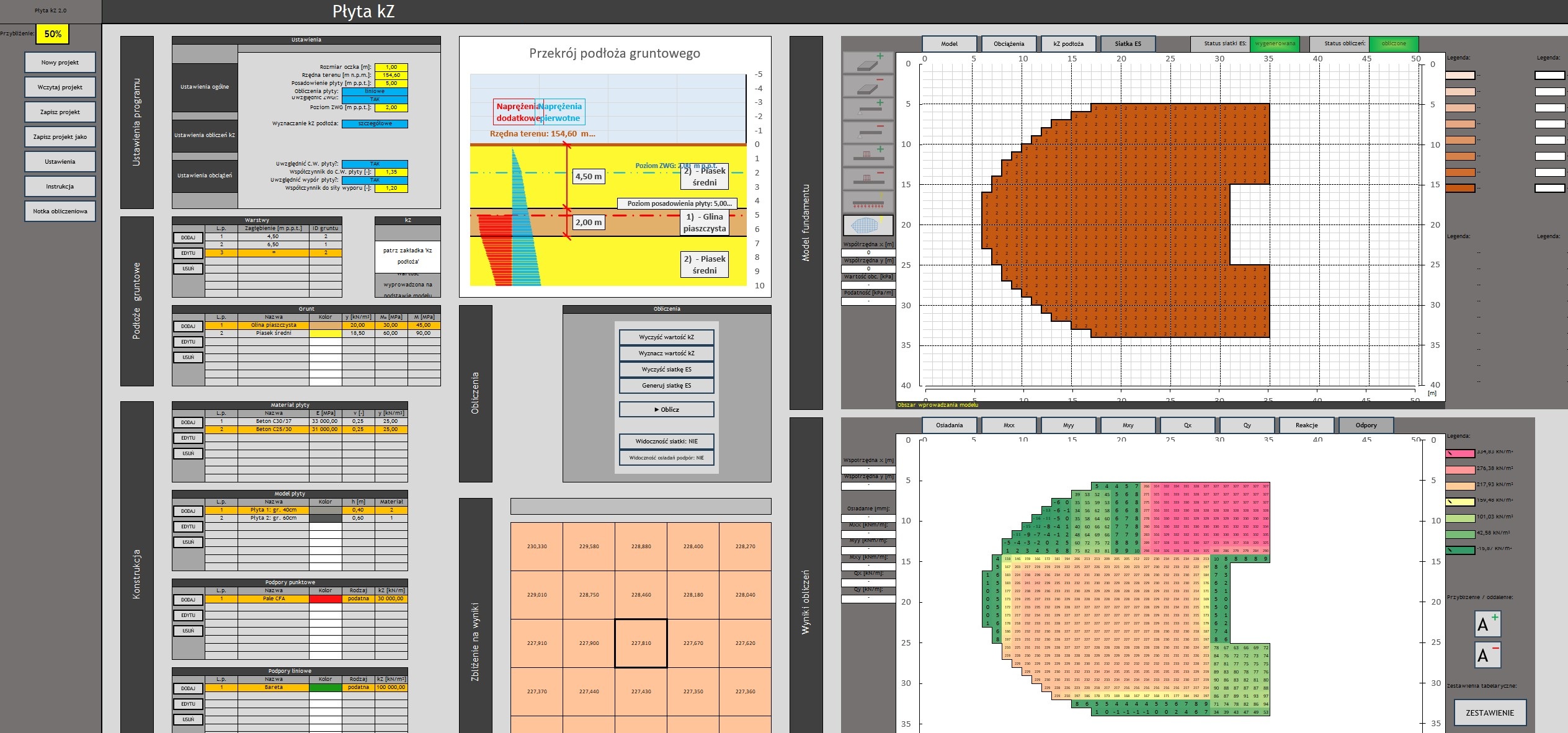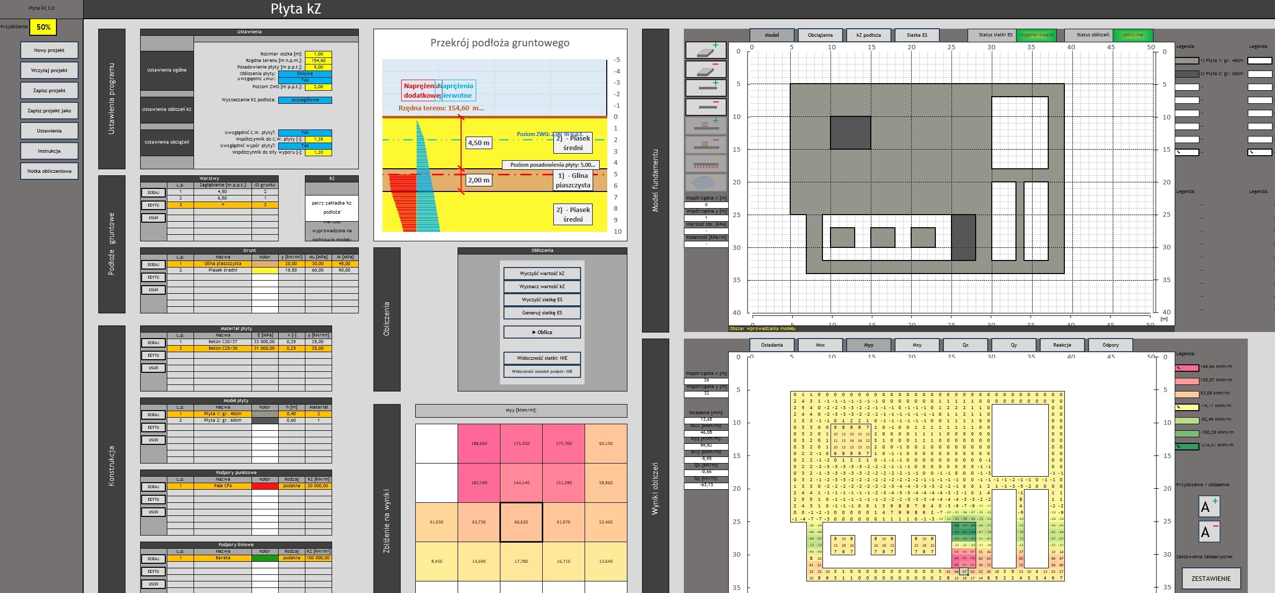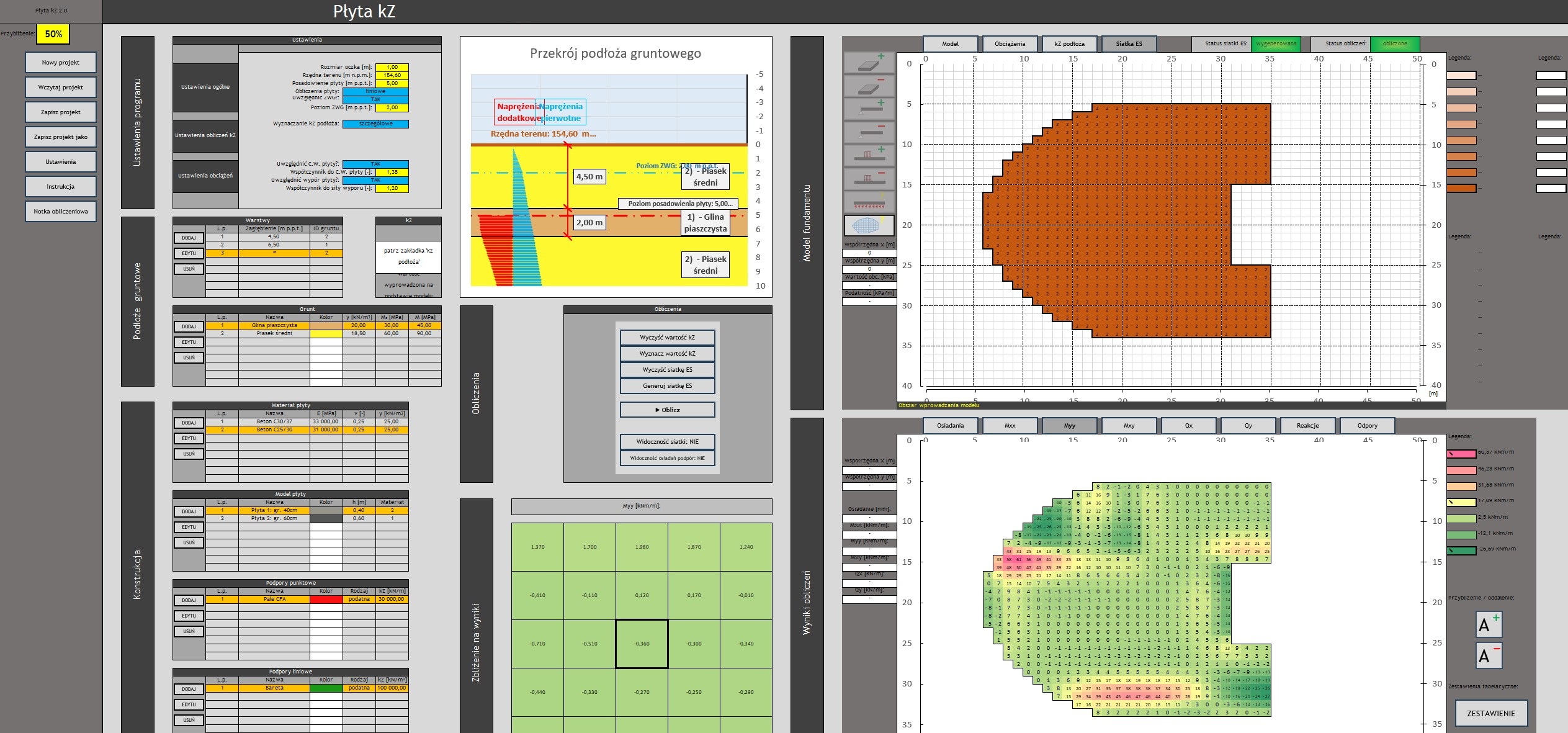 - Mapa odporów gruntu w wynikach – Wizualizacja rozkładu odporów gruntu, ułatwiająca interpretację współpracy płyty z podłożem.