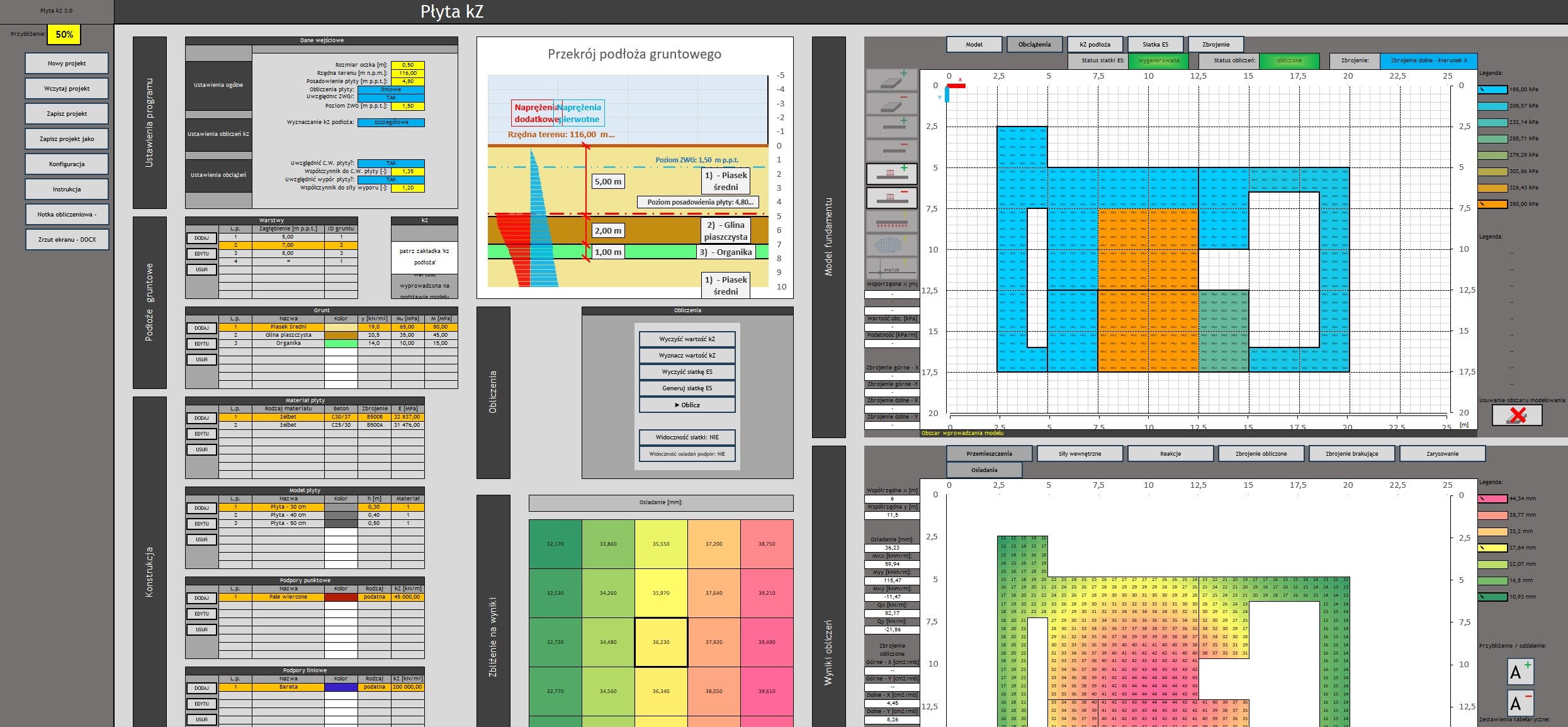 Program został oparty na normie europejskiej PN-EN 1997 (EC7) oraz polskiej PN-81 B-03020. Pozwala na zwymiarowanie stopy (prostokątnej/kwadratowej) lub ławy fundamentowej w gruncie uwarstwionym w granicznym stanie użytkowalności (SGU). Całość została tak opracowana, aby na każdym kroku sprawdzać warunki krytyczne i w razie niespełnienia danego kryteria, informować o tym Użytkownika odpowiednim monitem. Forma arkusza jest przejrzysta i czytelna, a każdy obliczany parametr został opisany. Program został wyposażony w wykresy, które pozwalają na szczegółową analizę naprężeń pionowych w ośrodku gruntowym.