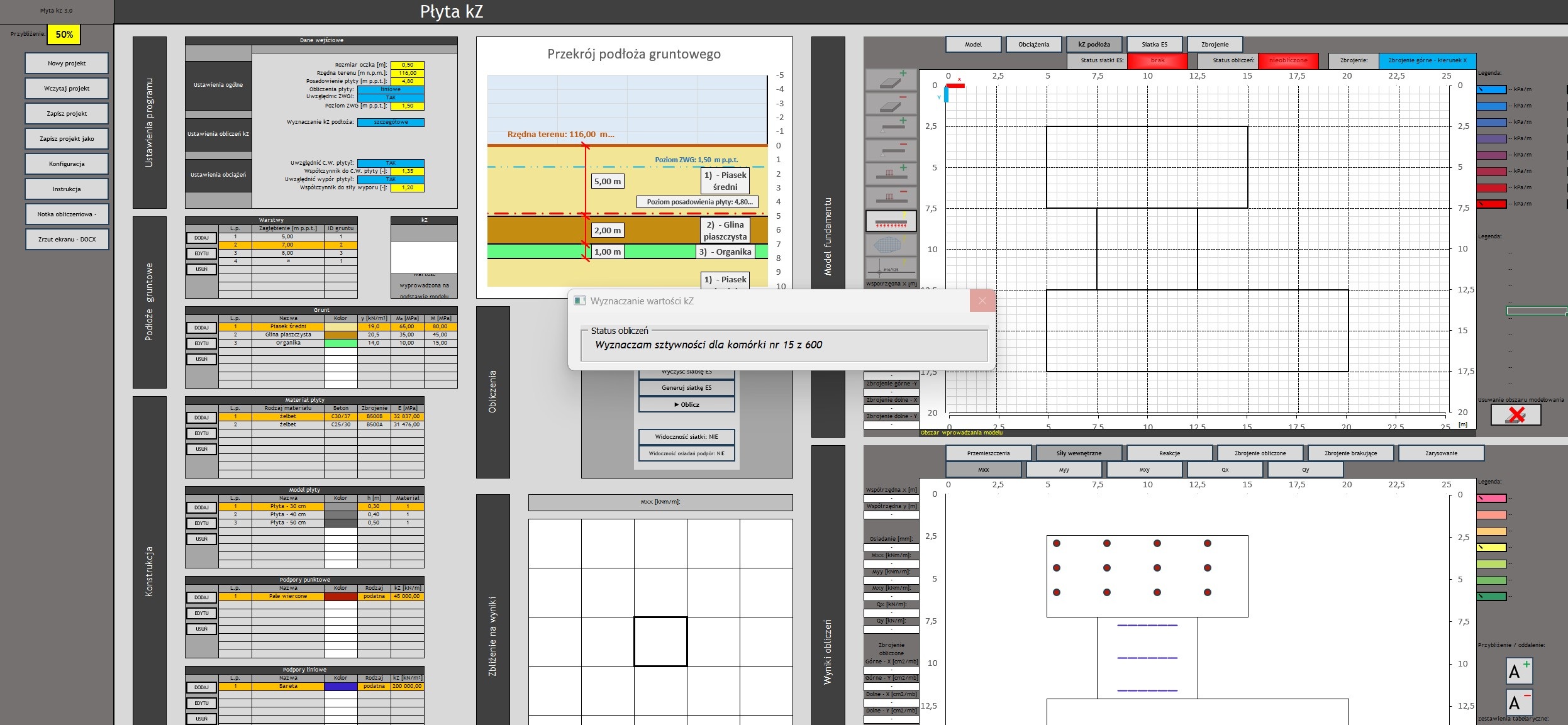 - nośność podłoża gruntowego (możliwość zamodelowania dwóch warstw geotechnicznych z opcją obliczenia nośności podłoża dla fundamentu zastępczego),